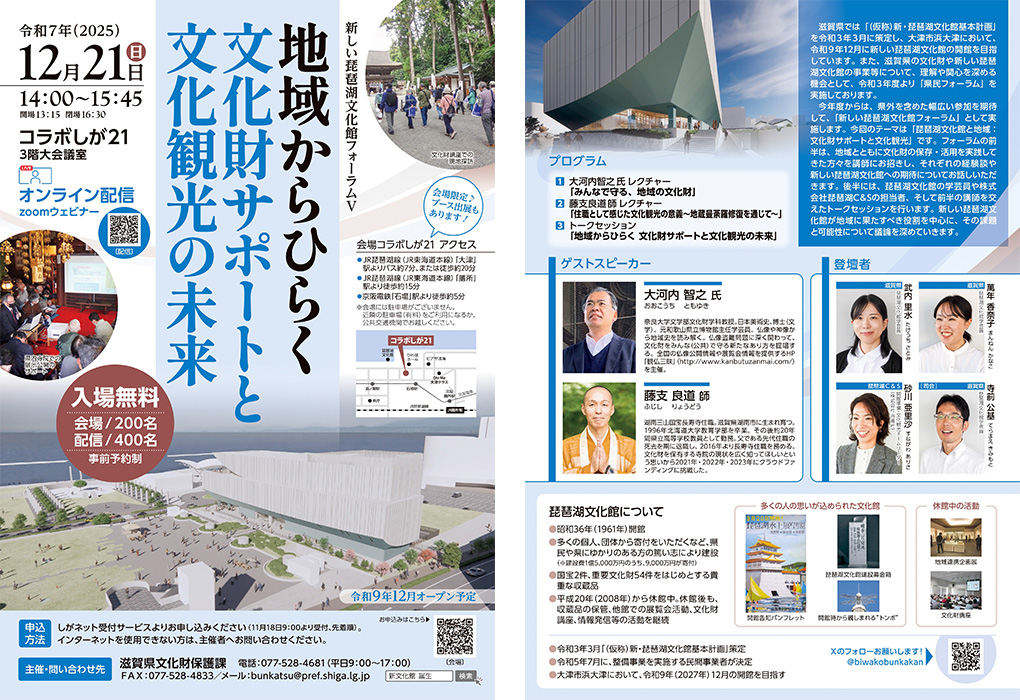 Speakers | Satomi Takeuchi: Curator, Lake Biwa Cultural Museum Kanako Mannen: Curator of Lake Biwa Cultural Museum Sunagawa Arisa: Lake Biwa C&S Opening Preparation and Culture Tourism Team Leader (TANSEISHA Co., Ltd.) Mr. Kimimoto Teramae: Curator, Lake Biwa Cultural Museum [Moderator] |