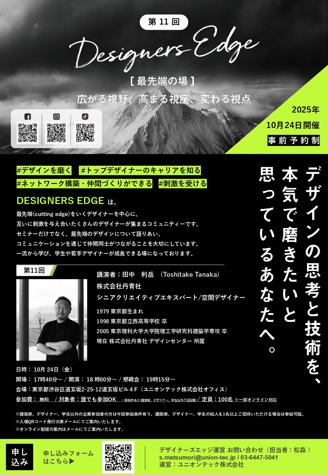 2025年10月24日(金)に、ユニオンテック株式会社オフィスにて開催されるイベント「第11回 DESIGNERS EDGE」に、デザインセンター シニアクリエイティブエキスパート 田中 利岳が登壇します。