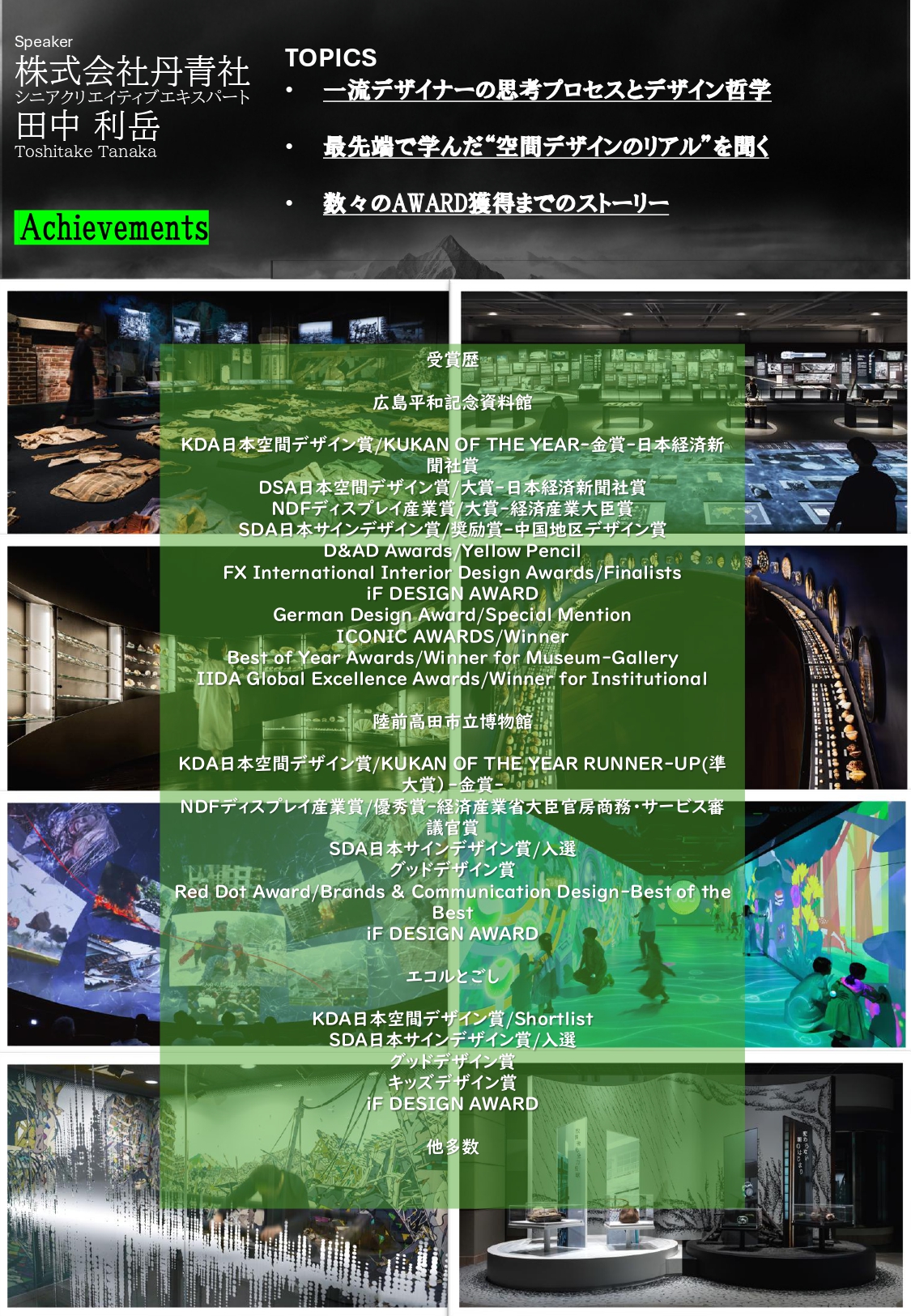 講演では主に、展示デザインによる課題解決と、試行×思考の挑戦とその原点について、2025年開催の『大阪・関西万博 国際赤十字・赤新月運動館』などの具体的な事例を交えながらご紹介します。領域を問わず若手・中堅クリエイター/デザイナーを中心に幅広くコミュニケーションがうまれる場を提供いたします。