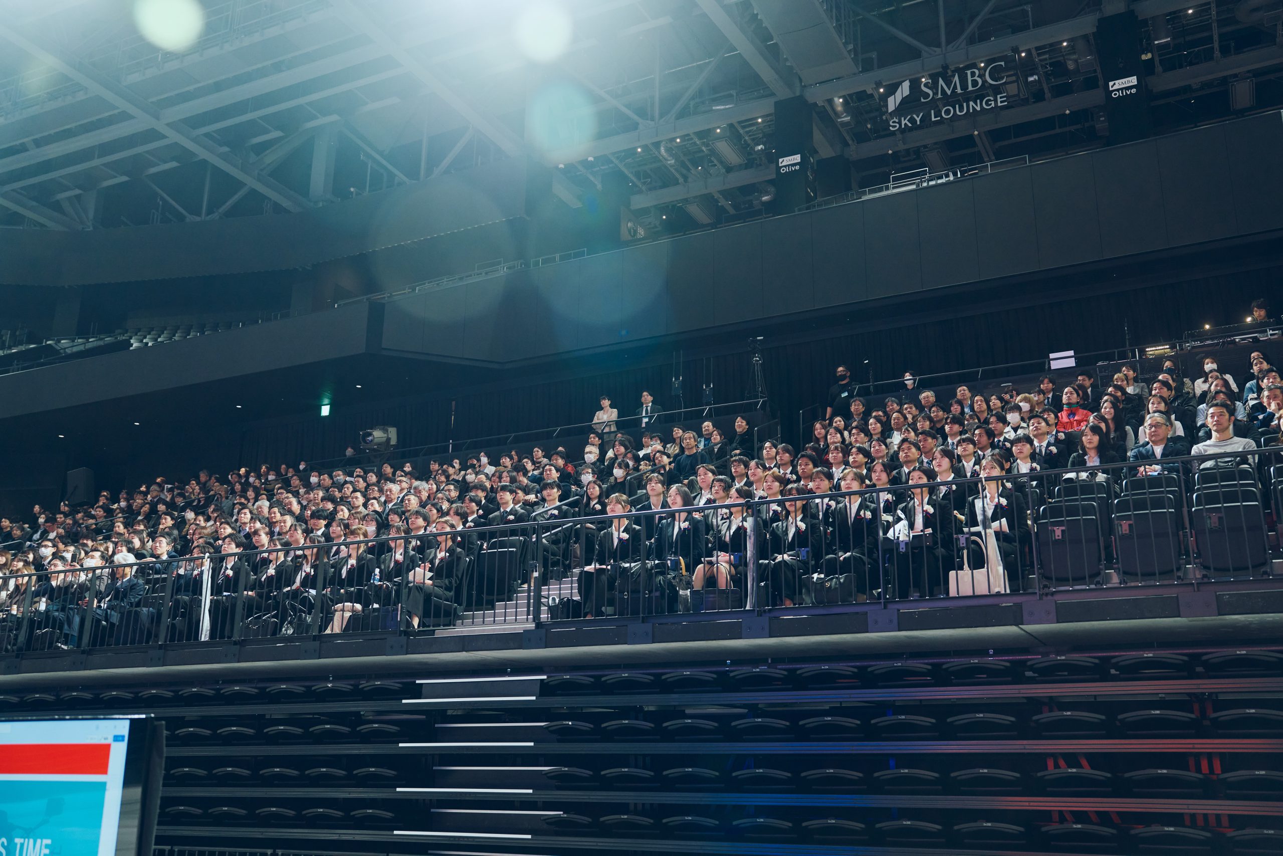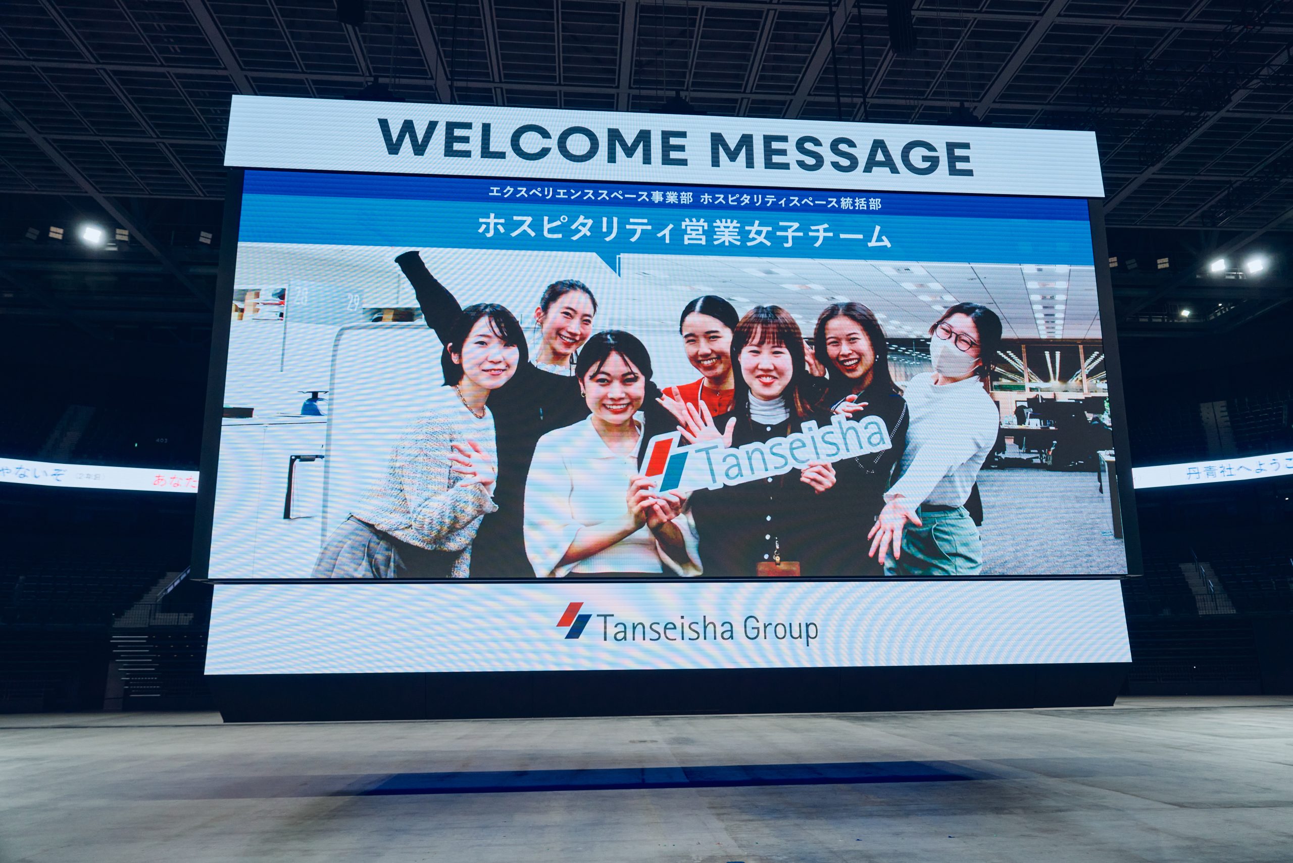 プログラムの進行はテーマパークのアトラクションを彷彿とさせる「ストーリーテラー」のナビゲーションで進行しました。新入社員の入場時には大型ビジョンやリボンビジョン、迎え入れる先輩社員からの鮮やかなウェルカムメッセージを掲出。また、当社がエリアコンセプト企画、デザイン・設計、制作・施工を担当した試合の迫力と特別なホスピタリティを同時に楽しめるオープンテラス「JAPAN AIRLINES TERRACE SUITE」からの中継を交えるなど、空間づくりのプロフェッショナルならではの施設全体を活用したダイナミックな演出を行いました。