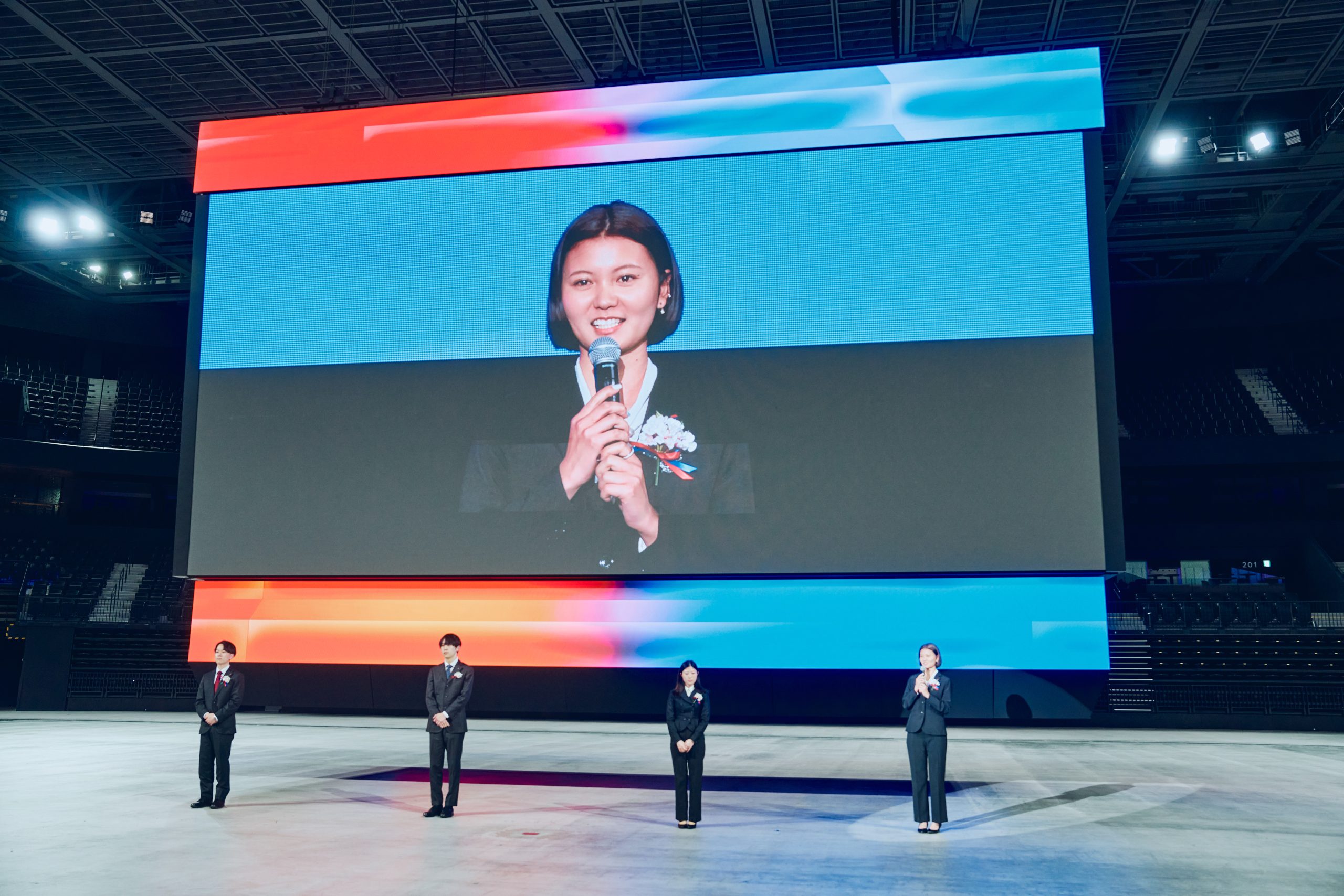 受賞した社員からプロの仕事の真髄が直接語られた後、大型ビジョンの前に立った4名の新入社員代表が、自身の思いや抱負を力強く宣言。先輩たちからの「バトン」が、確かな決意とともに次世代へと手渡されました。